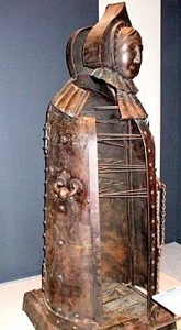 道を挟んだ向かい側の明治大学は、いち早くオフィスビルのような箱。風格のあった旧記念館(設計・大森茂・1930年)は跡形もない。でも、今も変わらず博物館の中で待っていてくれたのが「ニュルンベルクの鋼鉄の処女」。中世ヨオロッパの拷問具だ。原寸大の人が入る、中が空洞の棺桶状の箱。全体の輪郭は人間の形をなぞっていて、女性(聖母マリア)の顔を持つ。前半身部分は観音開きの扉になっており、兆番を用い開閉できるつくりになっている。背筋が凍りつくのは、長く太く鋭い釘が箱の内側に向かって無数に生えているのを見たその時だ。拷問具とは言うけど、これを見るだけで、十分効果的だったに違いない。人間はどこまで残酷になれるのだろう。