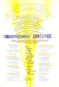 蘆野さんのアトリエには、制作中、完成品を問わず作品がいくつもあるが、例えばJ.S.BACHの「マタイ受難曲」全曲の歌詞を一枚の紙に書き記しながらそれを十字架の型に纏めるような作品などを拝見すると、驚異的な集中力の持続に感服せざるをえない。アトリエの窓先にある緑を見ながら、弛緩と緊張を果てしなく繰り返す作業は想像を超えている。