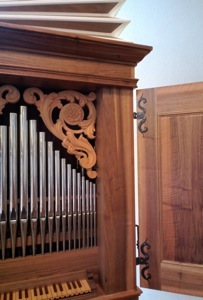 密度の高いクルミ材で作られた美しい筐体に、錫と鉛を砂型の上に流し込んで古典的な技法で作られた金属パイプが納められており、頭頂部には大きなふいごが鶏冠の様に聳えている。そこかしこにアイアンワークによる丁番やハンドルがついていて、全体の景色を引き締める。楽器が見せてくれるのは用の美だ。