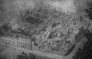ジョン・ソーンがガンディに描かせた「イングランド銀行鳥瞰図」(1830)、磯崎新が描いた「廃墟になったつくばセンタービル」(1985)を思い起こす。円明園の施主は清王朝、イングランド銀行は中央銀行、つくばの場合は住宅都市整備公団、いずれも国家そのものである。建てても壊れても、国家の建築が担わされたベクトルの方向は変わらない。