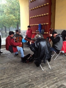 博物館を出たら大雨だ。風も強くなってきた。地下鉄の駅まで3キロぐらいかな。最初の誓いを破ってタクシーを拾おうとしてもタクシーが来ない。しょうがないからまた天壇公園を横切って駅に向かう途中、楽しい路上セッションに出くわした。公園入口の大きな門の下、雨に濡れないところで二胡2、月琴(?)2、チェロの5人がいかにも中国!という音楽を合奏している。さらにしばらく歩くと天壇の中にある屋根付き回廊では、雨宿りの最中だろうか、多くの中国人たちがアコーディオンを伴奏に合唱している。Red River Valley の中国語版だ。同じような輪が回廊のあちこちにいくつもある。こういう局面で知らないもの同士が輪になり同じ歌を歌うことが日本にはあるだろうか?実に楽しそうだ。楽しい。