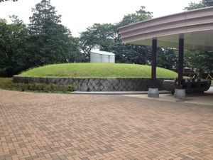 小平霊園はこの樹林墓地ができる前、平成10年に「合葬埋蔵施設」(写真下)を導入、一つのお墓に多くの遺骨を一緒に埋蔵する方式を始めている。芝生で仕上げられた直径20メートル程の浅い円形ドームが2つ並んで、それぞれの前に献花台がある。ドームの地下は2層になっていて、地下1階には桐箱に入った骨壺を安置する棚、地下2階には安置経過20年後に遺骨を骨壺から出し共同埋蔵するためのスペースが用意されている。地下に入れるのは職員のみ。こちらの使用料は95,000円、20年の安置期間を省略して直接共同埋蔵する場合は61,000円。ちなみに一般的な埋蔵施設(いわゆる普通のお墓)の場合、使用料が数百万円、さらに墓石代や施工費、毎年の管理料が必要になる。